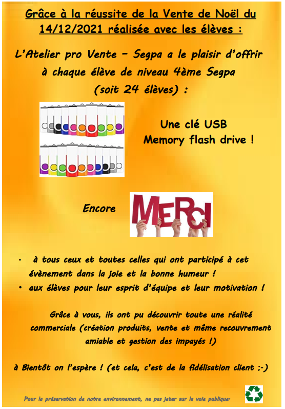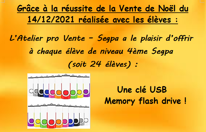 Grâce à la vente de noël du 14/12/2021, l'atelier vente V.D.L Segpa a le plaisir d'offrir à chaque élève de 4ème Segpa une clé USB