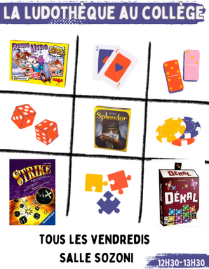 Par Admin Stendhal, publié le mardi 7 octobre 2025 23:04 - Mis à jour le mardi 7 octobre 2025 23:05Les ateliers jeux de la ludothèque sont de retour au collège à compter du 7 novembre, tous les vendredis de 12h30 à 13h30 en salle Sonzoni ; animés par l'équipe de Krystel, du pôle ludique de Bagatelle. -