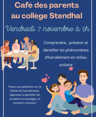 Par Admin Stendhal, publié le lundi 3 novembre 2025 21:42 - Mis à jour le lundi 3 novembre 2025 21:44Le vendredi 7 novembre à 9h au collège Stendhal, échangez autour du thème du harcèlement scolaire. -
