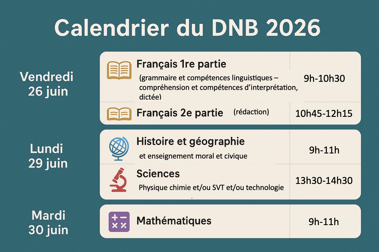 À compter de la session 2026, les modalités d’attribution du diplôme national du brevet (DNB) évoluent. Pour les candidats scolaires, l'obtention du diplôme national du brevet (DNB) résulte des moyennes annuelles de toutes les disciplines obtenues en classe de 3e (40%) et des résultats obtenus aux épreuves terminales de l'examen (60%).